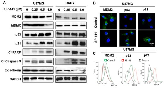 Our previous studies showed that SP-141 triggers a potent and specific elimination of MDM2 protein in breast cancer, pancreatic cancer, and hepatocellular carcinoma cells and the corresponding xenografts in a p53-independent manner [30,31,32]. To confirm these observations and to explore the possible clinical utility of SP-141 in brain tumors, we first determined the effect of SP-141 on MDM2, its targets, and apoptotic regulatory proteins. The p53 wt human glioblastoma U87MG and p53 mutant medulloblastoma DAOY cell lines were exposed to SP-141 (0.25–1 µM range) for 24 h, then Western blotting was performed to assess protein expression. Figure 2A shows a robust and SP-141 concentration-dependent upregulation of p21cip1, which was accompanied by a significant increase in the activated PARP and caspase 3 levels in both DAOY and U87MG cells. The increase in the p21 levels in response to SP-141 exposure is consistent with our previous findings that MDM2 is a p53-independent negative regulator of the CDK inhibitor [37]. The p53 protein showed a significant increase, while a distinct loss of the MDM2 was evident in both cell lines. The levels of E-cadherin, an epithelial-mesenchymal transition (EMT) regulator, and MDMX, an MDM2 partner which also negatively regulates p53, were also slightly reduced in both cell lines following SP-141 treatment, as shown in Figure 2A. Immunofluorescence studies confirmed that there was a detectable increase in the p53 and p21 levels, along with a loss of MDM2, in the U87MG cells, as shown in Figure 2B. Additionally, we performed a flow cytometric quantitation of these proteins using specific monoclonal antibodies and isotype IgG controls in U87MG cells treated with SP-141. There were clear peak shifts to the right for p53 and p21 and a leftward shift for MDM2 observed in these experiments, as shown in Figure 2C, confirming the increased p53 and p21 levels and elimination of MDM2 after SP-141 exposure.