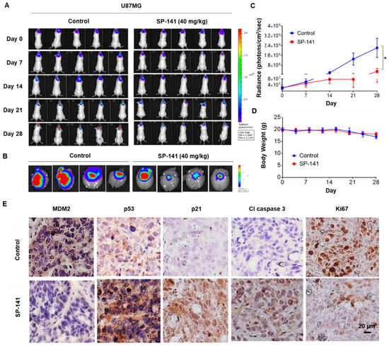 SP-141 shows excellent antitumor activity against U87MG human glioblastoma intracranial xenografts. (A) Representative images of bioluminescence acquisition of the brain tumors in nude mice after 0, 7, 14, 21, and 28 days of treatment. SP-141 was administered intraperitoneally at 40 mg/kg/day, 5 days per week for 4 weeks. SP-141 was dissolved in PEG400/EtOH/saline (57.1:14.3:28.6, v/v/v). The control group received the vehicle alone. (B) Ex-vivo bioluminescence from the brains of control (left panel) and SP-141-treated (right panel) mice. The scale indicates the fluorescence intensity in terms of radiant efficiency (p/sec/cm2/Sr). (C) Average time-dependent changes in bioluminescence radiance in U87MG xenografts in mice receiving SP-141 therapy over 4 weeks (* p < 0.01). (D) The average body weights of mice were plotted during SP-141 treatment. (E) Reduced MDM2 expression and activation of p53 signaling components were observed in U87MG intracranial xenografts following SP-141 treatment. Brain areas bearing the U87MG tumors from control and SP-141 treated nude mice were sectioned and processed for the expression of MDM2, p53, p21, cleaved caspase 3, and Ki67 proteins by immunohistochemistry. Representative staining patterns are shown. Scale bars: 20 µm.