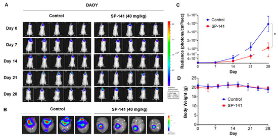 In addition, mice with the orthotopic DAOY medulloblastoma xenografts were treated with the same SP-141 dosage and schedule described above. The results from DAOY tumors are shown in Figure 4. The representative spatial distribution of photons in the animal brains is shown in Figure 4A, which revealed a significantly lower signal in the SP-141-treated group. Quantitation of the ex-vivo bioluminescence in mouse brains on day 28, as shown in Figure 4B, showed a 10.5-fold signal reduction in the SP-141-treated group. The average bioluminescence radiance changes from all eight animals in the group were determined and plotted against the treatment time and are shown in Figure 4C (p < 0.01). There was a 9-fold reduction in the tumor burden after SP-141. Again, there were no changes in the animal body weights during the treatment, reflecting the non-toxic nature of the drug. Of note, the DAOY xenografts were more sensitive than the U87MG glioblastoma, which was consistent with the IC50 of SP-141 against these cell lines, as shown in Figure 1A.