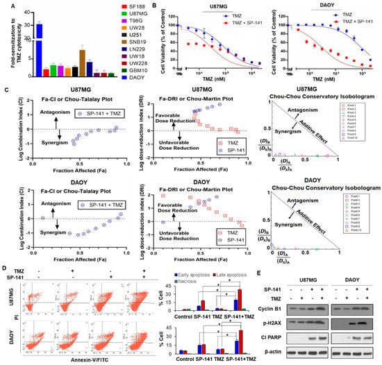 SP-141 sensitizes brain tumor cells to temozolomide treatment. (A) Bar graph showing the potentiation of TMZ cytotoxicity by SP-141 in a panel of 11 glioblastoma and medulloblastoma cell lines. The tumor cells were simultaneously exposed to SP-141 (at their respective IC20 values) and varying concentrations of TMZ (3 µM to 2 mM). The mean IC50 values of TMZ alone and those of the TMZ + SP-141 combinations were calculated in four independent cytotoxicity assays, each run in triplicate. The average fold-increase in cell killing (± SEM) for the TMZ + SP-141 combination was calculated and is represented in the bar graphs. (B) Potentiation of TMZ cytotoxicity by SP-141. The cytotoxicity of TMZ alone and in combination with SP-141 (at its IC20 concentration) against U87MG and DAOY brain tumor cells is shown. (C) Analyses of synergism in the cytotoxicity of the SP-141 + TMZ combination in DAOY and U87MG cells as determined by the CompuSyn software. The combination index (CI, Chou–Talalay plots) and dose-reduction index (DRI, Chou–Martin Plots) were generated according to the levels of growth inhibition (fraction affected, FA) by each drug used individually and in combination. The normalized isobologram showed that all 10 combination data points were located in the lower left, indicating synergism. The combination index (CI) = (D)A/(Dx)A + (D)B/(Dx)B where (D)A and (D)B were the concentrations of each drug alone required to exert x% effect, while (Dx)A and (Dx)B were the concentrations of drugs in combination to elicit the same effect. (D) Representative Annexin-V-FITC staining of DAOY and U87MG cells treated with 0.25 µM SP-141 and 60 µM TMZ, alone and in combination for 24 h. The mean percentage of cells in early and late apoptotic stages from four experiments of Annexin-V staining are shown in the bar graph. The differences in the early and late apoptotic populations in the cells treated with TMZ + SP-141 compared with TMZ alone or SP-141 alone were statistically significant (* p < 0.01). (E) The cells were treated with SP-141 and TMZ for 24 h prior to analyses of the protein expression.