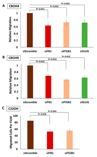 We previously identified CTCs to have increased FN1 expression as compared to primary tumor cells [29]. In agreement with FN1’s established role in migration [5,16], CTCs also exhibited enhanced migration. Interestingly, we were the first to report FN1’s regulation of ITGB1 and SLUG in CTCs [29]. Both ITGB1 and SLUG are molecules with previous implications in migration as well [39,40,41,42,43,44,45,46]. To confirm whether FN1 and its downstream effectors, ITGB1 and SLUG, are necessary for CTC migration, we performed transient knockdowns of FN1, ITGB1, and SLUG. As shown in Figure 1A,B, knockdown of all three molecules caused a significant decrease in migration in comparison to siScramble. CBOH4 exhibited a 36% decrease in migration when FN1 was knocked down, followed by a 27% and 28% decrease when ITGB1 and SLUG were knocked down. Similarly, CBOH9 migration lowered by 31% when FN1 was knocked down, followed by 43% and 37% decreases upon ITGB1 and SLUG knockdown. Unfortunately for C22OH, our single CRPC CTC line, we were unable to get a successful SLUG knockdown. Nevertheless, as shown in Figure 1C, migration was reduced by 39% and 35% when FN1 and ITGB1 were knocked down, respectively.