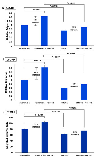 Finally, in our C22OH cell line, the addition of recombinant FN1 also increased migration by 31% in those cells transfected with siScramble but not siITGB1. C22OH cells transfected with siITGB1 exhibited a significant decrease in migration by 22% that was unable to be salvaged completely by the addition of recombinant FN1 (see Figure 3C).