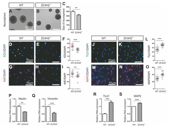 NSCs were isolated from E14.5 mouse embryonic cortex of WT (wild type) or ZC4H2−/− (ZC4H2-KO) littermates. The NSCs formed classical neurospheres in the uncoated dish and expressed the NSC markers Nestin and Sox2 (Supplementary Figure S1). We checked whether loss of ZC4H2 affected NSC proliferation. The neurospheres formed by WT NSCs were bigger than that of ZC4H2−/− NSCs (Figure 1A–C) under proliferation culture conditions, suggesting slower proliferation of the ZC4H2−/− NSCs. Indeed, the ZC4H2−/− NSCs showed lower EDU incorporation ratio and Ki67 positive ratio than WT NSCs (Figure 1D–I). Under the differentiation condition, the NSCs were efficiently induced to differentiate into neurons, as indicated by the expression of the neuronal markers β-tubulin III (TUJ1) (Supplementary Figure S1). However, the proportion of differentiated MAP2-positive and TUJ1-positive cells increased in the ZC4H2−/− group (Figure 1J–O) relative to the WT NSCs. The expression levels of TUJ1 and MAP2 mRNA were upregulated after NSC differentiation in ZC4H2−/− NSCs compared with WT NSCs (Figure 1R,S). On the contrary, the stem cell markers (Nestin and Vimentin) had a lower expression level in the ZC4H2−/− NSCs than in WT NSCs (Figure 1P,Q).