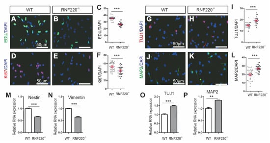 Loss of RNF220 inhibited NSC proliferation and promoted differentiation of NSCs. (A–F) Loss of RNF220 inhibited NSCs proliferation by EDU incorporation assay (A–C) and Ki67 immunostaining (D–F); the nuclei were marked by DAPI. Scale bar: 50 µm. (C,F) The quantification data for (A,B,D,E) respectively. (G–L) Immunofluorescence analyses of the differentiated neurons from WT and ZC4H2−/− NSCs for β-tubulin III (TUJ1) (G–I) and MAP2 (J–L); the nuclei were marked by DAPI. Scale bar: 50 µm. (I,L) The quantification data for (G,H,J, K), respectively. (M,N) Expression of stemness marker genes (Nestin and Vimentin) in WT and RNF220−/− NSCs. (O,P) Expression of neuronal marker genes (TUJ1 and MAP2) in differentiated WT and RNF220−/− NSCs. β-actin was used as an internal control. ** p < 0.01, *** p < 0.001, two-tailed Student’s t-test. Data represent mean ± SD from three independent biological replicates.