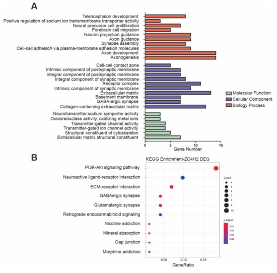Gene Ontology (GO) classification and scatter plot-enriched Kyoto Encyclopedia of Genes and Genomes (KEGG) pathways of the differentially expressed genes (DEGs) in the ZC4H2−/− NSCs compared to the WT NSCs. (A) GO annotations showing significant enrichment of three main categories (biological process, cellular component, and molecular function) with the adjusted p-value < 0.05. The x-axis indicates the number of genes in each category. Top 10 terms of biological process and cellular component and all terms of molecular function were enriched. (B) KEGG enrichment result. The x-axis represents the gene ratio, which refers to the ratio of DEG numbers annotated in the pathway term to all gene numbers annotated in the pathway term. The circle size indicates the number of DEGs that are associated with each significant pathway. The circle color indicates the significant level with the adjusted p-value < 0.05.