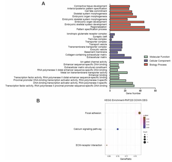 Similarly, RNA-Seq analysis of the RNF220−/− and WT NSCs identified 433 DEGs (192 upregulated and 241 downregulated; p < 0.05) (Supplementary Figure S2B). In GO analysis, these genes were mostly enriched in the processes, including pattern specification, embryonic skeletal system development, cell fate commitment, extracellular matrix, transcription factor activity, and so on (Figure 4A). In KEGG pathway analysis, the downregulated genes in RNF220−/− NSCs were suggested as being involved in ECM–receptor interaction, focal adhesion, and calcium signaling pathways (Figure 4B), whereas no clear enrichment was found among the upregulated genes.