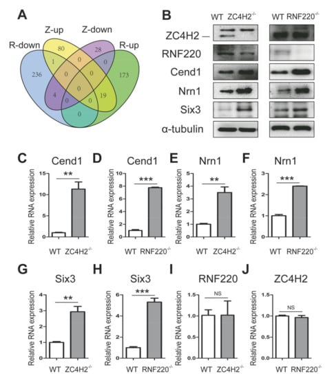 Validation of the shared DEGs generated from RNA-Seq between the ZC4H2−/− and RNF220−/− NSCs. (A) Venn diagrams of shared DEGs between the ZC4H2−/− and RNF220−/− NSCs. In total, 24 DEGs were shared between the two groups. Z-up/down and R-up/down represent ZC4H2-Seq upregulated/downregulated DEGs and RNF220-Seq upregulated/downregulated DEGs, respectively. (B) Western blot analysis for ZC4H2, RNF220, Cend1, Nrn1, and Six3 protein expression level in WT, ZC4H2−/−, and RNF220−/− NSCs. (C–J) qRT-PCR analysis showing the relative mRNA levels of Cend1, Nrn1, Six3, RNF220, and ZC4H2 in WT, ZC4H2−/−, and RNF220−/−NSCs. β-actin was used as an internal control. NS represents no significant difference (p > 0.05). ** p < 0.01, *** p < 0.001, two-tailed Student’s t-test. Data represent mean ± SD from three independent biological replicates.