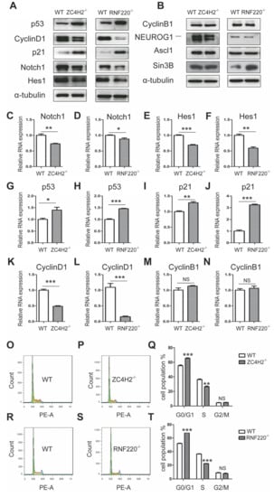 In order to understand the underlying regulatory role of ZC4H2/RNF220, we focused on the group of potential common targets of ZC4H2 and RNF220. Among these DEGs that were identified by the above RNA-Seq, Cend1, Nrn1, and Six3 have been reported to promote neuronal development and neurogenesis [23,24,25,26,27]. We further confirmed the upregulation of Cend1, Nrn1, and Six3 by real-time PCR and Western blot (Figure 5B–H and Figure S3A,B). The neuronal lineage-specific protein Cend1 has been shown to promote cell cycle exit and neuronal differentiation during neurogenesis through regulating the p53-CyclinD1 and Notch1 signaling pathways [23,28,29]. The protein and mRNA level of CyclinD1 was downregulated both in ZC4H2−/− and RNF220−/− NSCs, whereas those of p53 and p21 were elevated (Figure 6A,G–L, and Supplementary Figure S3C,D). The expression of CyclinB1 remained unchanged (Figure 6B,M,N and Figure S3E–F). We characterized the ZC4H2−/− and RNF220−/− NSC cell cycle transition by flow cytometry analysis, and found that loss of ZC4H2 or RNF220 increased the ratio of G0/G1 cell population and decreased the ratio of S cell population (Figure 6O–T), which is consistent with a lower EDU incorporation ratio in ZC4H2−/− and RNF220−/− NSCs (Figure 1D–F and Figure 2A–C). In addition, the mRNA and protein levels of Notch1 and Hes1 were downregulated in both ZC4H2−/− and RNF220−/− NSCs (Figure 6A,C–F and Supplementary Figure S3C,D). These data were consistent with the model wherein the RNF220/ZC4H2 complex likely regulates neurogenesis through the Cend1/p53-CyclinD1/Notch cascade.