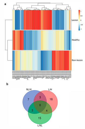To identify candidate miRNAs not previously described as differentially expressed in psoriatic patients, NGS was performed from five psoriasis patients (lesional and non-lesional skin) and five healthy subjects. Forty-nine miRNAs were differentially expressed in at least one comparison: healthy (H) skin vs. non-lesional (NL) skin, H vs. lesional (L) skin or L vs. NL skin with a Bonferroni adjusted p-value < 0.05. The dendograms of a heatmap show a greater similarity between the samples of healthy subjects and non-lesional skin of psoriasis (Figure 1a). Thirteen out 49 miRNAs were differentially expressed (± 2-fold) between NL and H skin, while a total of 23 miRNAs were differentially expressed in L vs. H and 22 in L vs. NL (Table S1 and Figure 1b).