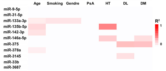 On the other hand, we did not detect any differences in miRNA expression associated with the presence of psoriatic arthritis (PsA). Dyslipidemia was associated with higher levels of miR-375 (β-coeff = 1.224, p-value = 0.001), and lower levels of miR-146a (β-coeff = −0.969, p-value = 0.038) and miR-3145 (β-coeff = −1.194, p-value = 0.027). Differences in miR-146a (β-coeff = 1.020, p = 0.010) and miR-375 (β-coeff = −1.110, p-value = 0.001) were also observed in DM. Finally, lower levels of miR-135b (β-coeff = −0.703, p < 10−3) were detected in those patients with arterial hypertension (Figure 2).