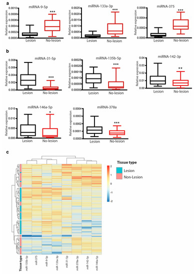 Our data showed that psoriatic lesion skin expressed lower levels of miR-9-5p, miR-133a-3p and miR-375 compared with non-lesional skin (p-value < 0.050, Figure 3a). On the contrary, higher levels of miR-135b-5p, miR-378a, miR-142-3p, miR-146a-5p and miR-31 were detected in lesional skin (Figure 3b). A heat map of hierarchical clustering of skin samples based on the expression of validated miRNAs is shown in Figure 3c. No significant differences were observed for miR-3145, miR-3687, and miR-33b (data not shown).