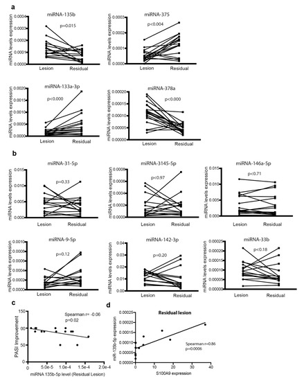 miRNA levels in lesional skin before treatment onset and in residual lesions after 3 months of treatment. (a) Expression of miRNA-135b-5p, miRNA-133a-3p, miRNA-375 and miRNA-78a in lesional skin before treatment onset and in residual lesions after 3 months of biological therapy (n = 15). (b) Expression of miR-31-5p, miR-3145-5p, miRNA-146a-5p, miR-9-5p, miR-142-3p and miR-33b as in (a). Lines indicate matched lesional and residual lesions from the same patient. Data correspond to the relative expression with respect to the geomean of 5S and RNU1A1 expression. Data were analyzed using Wilcoxon signed rank test. (c) Correlation between the levels of miRNA-135b in residual lesions and the disease improvement after 3 months of treatment. (d) Correlation between the levels of miR-135b and S100A9 in residual lesions. Data were analyzed using Spearman test.