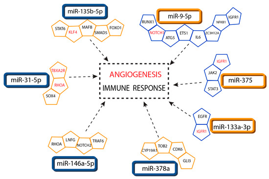 Interaction network of miRNAs and target mRNAs associated with immune response and angiogenesis. Networks showing interactions between differentially expressed miRNAs and differentially expressed messenger RNA targets associated with immune response and angiogenesis (identified in red) processes. Interactions were identified using miRTarBase and subjected to the PANTHER system analysis. Interacting pairs were filtered to keep only those with anti-correlated expression. Only targets with functional support are shown. Upregulated molecules are shown in blue and downregulated ones in orange.