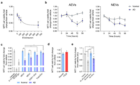 EVs from individual subjects were not pooled and their effects were assessed and analyzed separately, to respect their biological variability. First, we sought to determine whether AEVs labeled with the fluorescent lipid analogue PKH26 might be internalized by cultured E18 rat cortical neurons (Supplementary Materials Figure S3), as previously shown for NEVs [46]. After 1 h of incubation, we detected puncta-like PKH26+ structures in the soma and neurites of cells treated with AEVs of AD and normal participants (Figure S3c). Then, we used the MTT cell viability assay to evaluate whether AEVs and NEVs from participants with AD (n = 7) compared to cognitively normal controls (n = 6), might be neurotoxic in a concentration- and time-dependent manner (Figure 1). Both AEVs and NEVs from AD compared to the control participants decreased cell viability, with maximum effects produced by a concentration of 600 EVs/neuron (Figure 1a) and incubation for 48 h (Figure 1b), treatment conditions that were kept constant in subsequent studies, unless otherwise indicated. The neurotoxicity of AD AEVs and NEVs was comparable to excitotoxicity by 10 μM glutamate, hence physiologically relevant [54], and was cell of origin-specific (astrocytic and neuronal) and independent of putative soluble co-precipitates, since no cell viability differences were observed in the neurons treated with nonspecific CD81+ and total EVs from the same AD participants (Figure 1c). In a model including all EV types and terms for Group and Group*EV type interaction, NEVs of AD participants produced a significant MTT decrease (AD vs. Normal, p = 0.003), and so did AEVs (AD vs. Normal, p = 0.006), but CD81+EVs did not (AD vs. Normal, p = 0.904) and neither did total EVs (AD vs. Normal, p = 0.675). For the normal controls, there were no significant differences between EV types and no effects on MTT. For the AD participants, NEVs and AEVs had similar effects on MTT (AEVs vs. NEVs, p = 0.695), but AEVs decreased MTT compared to both CD81+ (p = 0.035) and total EVs (p = 0.029), and NEVs showed similar strong trends in pairwise comparisons (p = 0.087 and p = 0.067 respectively). Results were similar for models including age and sex. Moreover, there were no effects on the viability of neurons treated with AEVs from 2 participants with frontotemporal lobar degeneration (FTLD), compared to 6 controls (p = 0.934), suggesting that AEV neurotoxicity is not a common feature of neurodegenerative proteinopathies (Figure 1d). To replicate the AEV-mediated MTT cell viability decrease in a different cohort, we treated rat cortical neurons with plasma AEVs from 13 individuals from the Johns Hopkins Alzheimer’s Disease Center (JH ADC), with autopsy-confirmed AD or neurologically normal controls. AEVs of confirmed AD individuals induced a significant cell viability decrease compared to the vehicle-treated neurons (p = 0.02) and neurons treated with AEVs from controls (p = 0.02) (Figure 1e).
