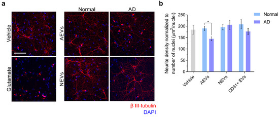 AD AEVs induce neurodegeneration. (a) Immunofluorescence of β III-tubulin (red) as an indicator of neurite density in E18 rat cortical neurons incubated with either AEVs or NEVs isolated from the plasma of AD patients and normal controls at 600 EVs/neurons for 48 h. Fluorescent confocal microscopy images at 25X magnification show that neuronal cultures treated with AEVs from AD participants exhibit decreased neurite density, compared to the vehicle-treated neurons and neurons treated with AEVs from normal participants, as well as with NEVs from AD and normal participants. Treatment with 100 μM glutamate was used as a positive control for neurotoxicity. DAPI staining in blue shows the localization of nuclei. Scale bar, 100 μm. (b) A bar graph showing the quantification of neurite density defined as the image area covered by β III-tubulin signal above the threshold normalized to the number of nuclei. Each bar represents the mean value ± SEM of 5–15 images, per treatment with NEVs, AEVs, and CD81+ EVs from 4 AD subjects and 3 normal participants in duplicates. There was significant neurite density decrease in the neurons treated with AEVs from AD compared to the normal participants (AD vs. Normal, p = 0.02); the difference was not observed in the NEV-treated (p = 0.891) or CD81+ EV-treated neurons (p = 0.252), suggesting a greater neurodegenerative potential for AEVs, compared to NEVs or CD81+ EVs. * p < 0.05.