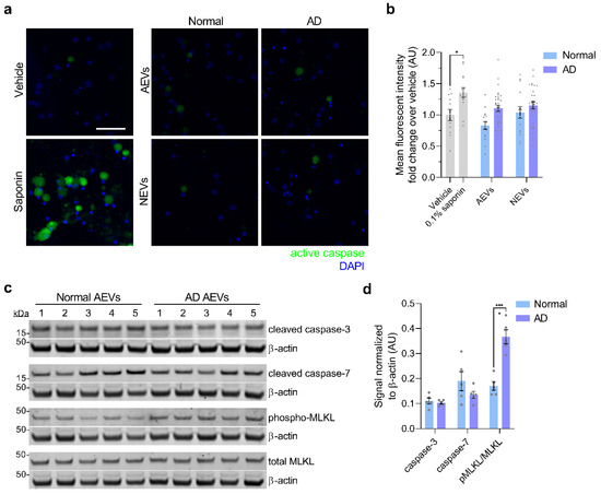 Given our previous finding of high levels of complement effectors, including MAC, in circulating AEVs of AD participants [32], we sought to evaluate if treatment with AD AEVs results in MAC deposition and membrane disruption in recipient neurons. First, we performed MAC fluorescent immunocytochemistry in AEV-treated neurons, using a validated C5b-9 antibody targeting the C5b-C9 heterodimer, the rate-limiting step of MAC pore formation [10], with β III-tubulin co-staining to visualize the neuronal structures. Results showed a dramatic increase of MAC accumulation co-localizing with β III-tubulin in the soma and neurites of cells treated with AD AEVs, for 1 h, compared to neurons treated with AEVs from control participants and vehicle (AD vs. Normal, p = 0.026; AD vs. vehicle, p = 0.012; Normal vs. vehicle, p = 0.051) (Figure 3a,b). To assess whether MAC accumulation leads to plasma membrane disruption, the first step towards osmolysis, we subjected EV-treated cells to the fluorescent ethidium homodimer-1 (EthD-1) membrane disruption assay, which is based on the detection of the membrane impermeable probe EthD-1, which fluoresces in association with nucleic acids (Figure 3c). Treatment of neurons with NEVs and AEVs from 4 AD, compared to 4 control participants, resulted in a significantly increased EthD-1 fluorescence fold-change over vehicle (for NEVs, AD vs. Normal, p = 0.044; for AEVs, AD vs. Normal, p = 0.024), suggesting that both AD NEVs and AEVs mediate neuronal membrane disruption; there were no differences in EthD-1 fluorescence over vehicle in the neurons treated with CD81+ EVs (p = 0.332) from AD patients, compared to the control participants. MAC-dependent cytotoxicity is accompanied by activation of the regulated necrosis pathway, known as necroptosis, which involves phosphorylation of the mixed-lineage kinase domain-like protein (MLKL) [55,56,57]. To further explore the mechanism of neurotoxicity induced by AEVs and NEVs, we evaluated whether EV-treated neurons exhibit necroptosis and apoptosis cell-death markers. We did not observe activation of apoptosis, as suggested by a fluorescent polycaspase in vivo assay that did not show activation of caspases in EV-treated neurons (Figure 4a,b). This was confirmed by Western blots showing that treatment of neurons with AD AEVs did not result in increased levels of the apoptosis markers cleaved caspase-3 and -7, compared to treatment with AEVs from the control participants (Figure 4c,d). Interestingly, neurons treated with AD AEVs showed increased levels of the necroptosis marker phosphorylated MLKL, in comparison to control AEVs (Figure 4c,d), providing evidence for necroptosis activation that is consistent with, although not pathognomonic of, a mechanism of MAC-mediated neurotoxicity.