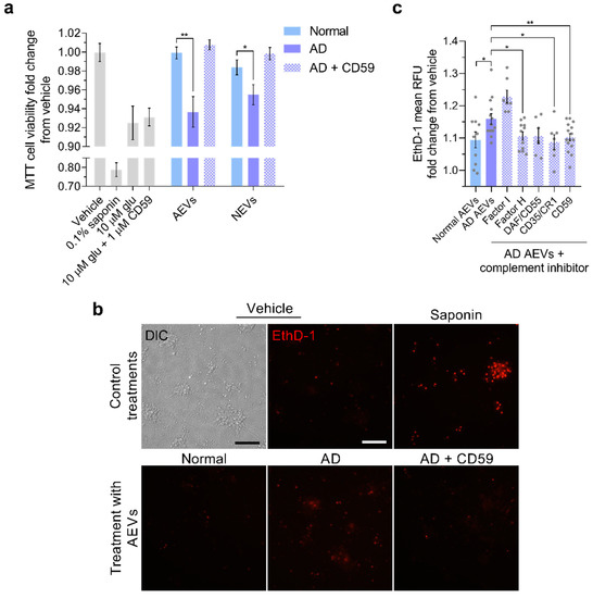 As an initial test of the hypothesis that AD AEVs cause neurotoxicity and membrane disruption due to their surface cargo of complement components, we stripped AEVs of their surface protein epitopes by trypsination, which abolished their effect on neuronal viability (Supplementary Materials Figure S5). Next, to assess whether MAC assembly in situ on the plasma membrane underlies the neurotoxicity of AD AEVs and NEVs, we co-treated rat cortical neurons with CD59 and AEVs or NEVs from AD and control participants and found that CD59 abrogated the AD AEV- and NEV-mediated cell viability decrease on the MTT assay (Figure 5a). (For NEVs, AD vs. Normal, p = 0.013; AD plus CD59 vs. Normal, p = 0.859; AD vs. AD plus CD59, p = 0.113; for AEVs, AD vs. Normal, p = 0.001; AD plus CD59 vs. Normal, p = 0.609; AD vs. AD plus CD59, p = 0.016.) This was further validated in a model of human iPSC-derived neurons subjected to the EthD-1 assay, the most stringent and relevant assay to the mechanism of complement and MAC-mediated cytotoxicity, in which co-treatment with CD59 blocked the AD AEV-mediated membrane disruption (AD vs. AD plus CD59 AEVs, p = 0.009; AD plus CD59 vs. Normal AEVs, p = 0.863) (Figure 5b,c). Similar, but weaker, protective effects were produced by other endogenous inhibitors that bind and destabilize the C3 and C5 convertases upstream from MAC assembly—complement receptor 1 (CR1; also known as CD35), which inhibits the classical cascade (AD vs. AD plus CR1, p = 0.012; AD plus CR1 vs. Normal AEVs, p = 0.923), and Factor H (AD vs. AD plus Factor H, p = 0.011; AD plus Factor H vs. Normal AEVs, p = 0.698), and at trend-level the decay-accelerating factor (DAF; also known as CD55) (AD vs. AD plus DAF, p = 0.091; AD plus DAF vs. Normal AEVs, p = 0.414), which inhibit the alternative cascade. Importantly, the effects of co-treatment with AD AEVs and only Factor I, which can degrade specific complement effectors only when aided by co-factors (e.g., Factor H and CR1) [8], were not different from the effects of AD AEVs alone (AD vs. AD plus Factor I, p = 0.349; AD plus Factor I vs. Normal AEVs, p = 0.053).