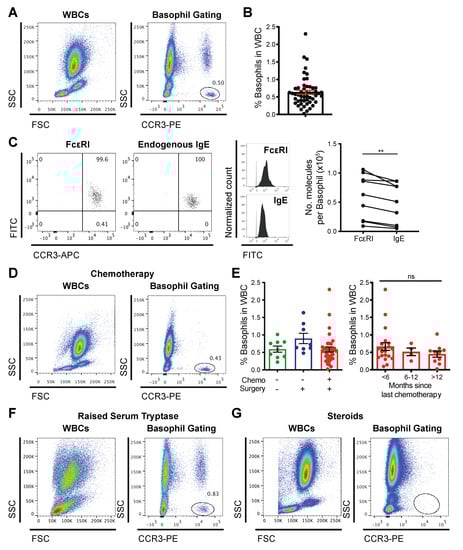 To study circulating basophils, we detected cell-surface CCR3, as this marker is expressed highly and stably, independent of the atopic status of the individual or activation state of the basophils [36]. We identified basophils (CCR3-PEhighSSClow, 0.64% ± 0.06 of white blood cells (WBC), range 0.02–2.3%) in unfractionated whole blood samples from 52 of a cohort of 53 patients with ovarian cancer (Figure 1A,B). CCR3-expressing circulating basophils from patients expressed the high affinity IgE receptor, FcεRI, and carried endogenous IgE on the cell surface. We quantified the number of FcεRI and endogenous IgE molecules per basophil (by QIFIKIT®). The significantly higher number of FcεRI molecules per basophil, compared to endogenous IgE molecules per cell in the same blood samples, demonstrated that some FcεRI were unoccupied (Figure 1C, n = 9). Although chemotherapy is known to impact immune cell counts, pre-treated patients showed a clearly defined CCR3highSSClow circulating basophil population (representative plot, Figure 1D); the proportions of basophils in white blood cells were comparable in blood from treatment-naïve patients (n = 9) and those who had previously undergone primary debulking surgery (n = 8), and prior treatment with surgery plus chemotherapy (n = 35). Basophil counts were independent of the time lapse since chemotherapy infusion (Figure 1E and Figure S2). CCR3highSSClow basophils were clearly identifiable in a blood sample from a patient with elevated serum tryptase (Figure 1F), but not from a patient who had received a recent prolonged course of high-dose oral corticosteroids (Figure 1G). In summary, basophils could be clearly identified in 98% of unfractionated blood samples from a diverse cohort of ovarian cancer patients, irrespective of treatment.
