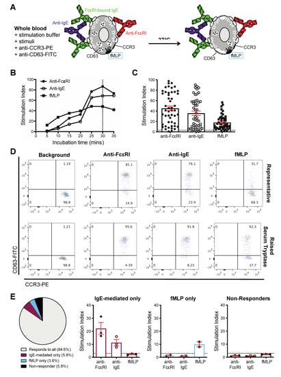 Basophil stimulation ex vivo. Cell-surface CD63 up-regulation triggered by IgE- and non-IgE-mediated stimuli (A). Stimulation for 5–35 min (B). Activation (≥3.0 Stimulation Index; cut-off: dotted line), was induced by IgE-mediated; anti-FcεRI and anti-IgE, and/or non-IgE-mediated; fMLP, stimulation (C,D). Analyses of basophil responses to none (“non-responders”), one or more stimulants (E).