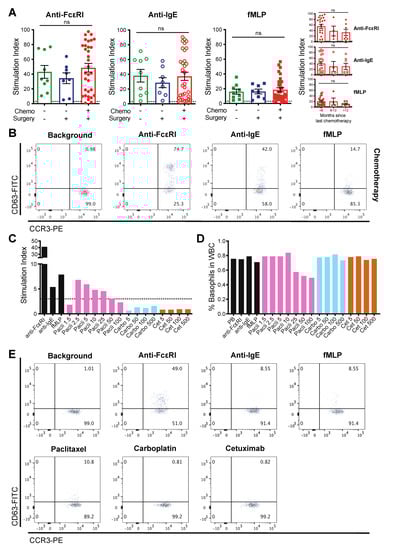 Anti-cancer treatments. Ex vivo basophil activation in blood from treatment-naïve patients, those having undergone surgery only, or surgery and chemotherapy (Stimulation Index—fold change in % CD63) (−/+ treatment previously received or not; A); time since last chemotherapy, right (B). Basophil activation by ex vivo stimulation with chemotherapy to which the patient had previously experienced systemic hypersensitivity (C), representative plots, (E), with marked basophil depletion at the highest concentrations (μg/mL; D). ns = not significant.