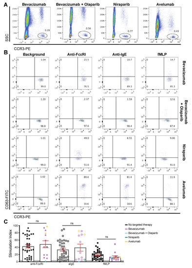 Targeted cancer therapies. Basophils were identified (gated in circles) in blood samples from ovarian cancer patients who previously received monoclonal antibodies bevacizumab (anti-VEGF) or avelumab (anti-PD-L1), or PARP inhibitors (olaparib or niraparib) (A). Ex vivo basophil activation levels (Stimulation Index—fold change in % CD63) triggered in the blood of these patients was comparable to patients not treated with targeted therapies (B,C). ns = not significant.