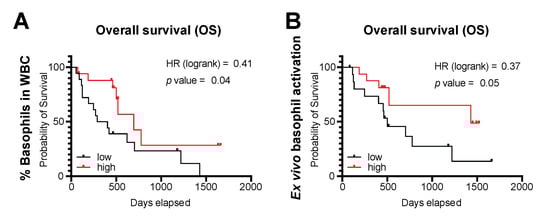 Circulating basophils and ovarian cancer patient outcomes. A higher proportion of basophils in the circulation (A) and a greater capacity for activation ex vivo (B) were associated with improved overall survival in ovarian cancer patients.