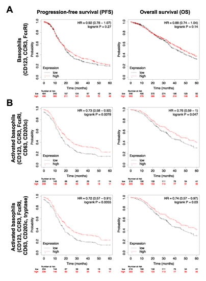 Despite their small numbers in circulating white blood cells, basophils can elicit powerful effector functions, playing a key role in allergies. Several reports suggest that basophils can interact with the tumor microenvironment [1,2,3,4], however, to date, the participation of basophils in cancer immune surveillance remains insufficiently evaluated. Basophils in the circulation may also be activated to promote type I hypersensitivity following administration of anti-cancer therapies, including chemotherapies [5,6] or monoclonal antibodies, such as cetuximab [7]. Nevertheless, circulating basophil populations, their propensity for activation and degranulation, and their prognostic value have yet to be comprehensively explored in cancer patients.