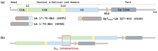 In stark contrast with the rod domain, the head and tail domains of IF proteins are dominated by regions predicted to be intrinsically disordered [16]. At the same time, both the head and the tail play an important role in the filament assembly by interacting with specific regions of the rod, and were suggested to accommodate a more ordered structure once the filament is formed [17,18,19]. In LA, the head domain is relatively short (26 residues) compared to cytoplasmic IF proteins. Specifically in lamins, the tail domain additionally contains a nuclear localization signal and an immunoglobulin-like globular domain (Figure 1a).