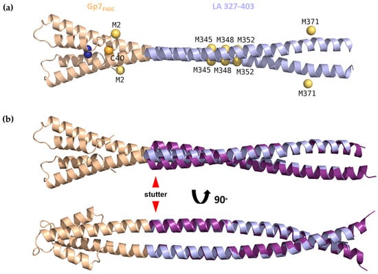 The crystal structure of the Gp7F40C-LA 327-403 fusion construct (Figure 2a) was established to 2.9 Å resolution. To this end, experimental phasing on sulphur atoms could be used, which had been facilitated by an engineered disulphide bridge in the dimeric Gp7F40C cap. Crystallographic data reveal good electron density for the capping motif and the lamin part up to residue 381, i.e., exactly the predicted end of the rod domain [14]. The tail domain part (residues 382–403) is disordered in the crystals. Superposition of the Gp7F40C-LA 327-403 structure with the previously determined structure of the LA 305-387 fragment (PDB code 1X8Y [64]) (Figure 2b) shows high structural similarity and gives a root mean square deviation (RMSD) of 1.29 Å for 54 Cα-positions (residues 327–380). Interestingly, differences between the two structures are the most noticeable near the N-terminal end of the LA sequence, which corresponds to the stutter (residues 327–330). While the LA 305-387 structure becomes increasingly disordered towards its N-terminus, our fusion with the Gp7F40C cap provides for a proper stabilization of the LA sequence. As a result, the CC geometry of Gp7F40C-LA 327-403 (Supplementary Figure S3a) reveals an unwinding that is in line with theoretical expectations for a stutter [58,68].