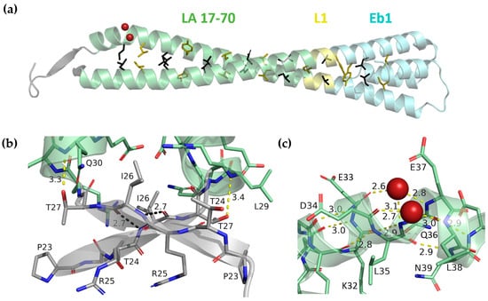 (a) Crystal structure of LA 17-70-Eb1. The head residues, coil1A and the first three residues of the linker L1 are coloured grey, pale green and yellow respectively. The Eb1 cap is coloured pale cyan. Two water molecules involved in H-bond bridges at the α-helical kink are shown as red spheres. Side chains of residues in ‘a’ (coloured black) and ‘d’ (coloured olive) positions starting with Leu35 i.e., the residues forming the hydrophobic core of the CC are shown as sticks. (b) Top view of the N-terminal end of the dimer featuring an antiparallel β-lock stabilized by two H-bonds (cyan dashed lines) between Ile26 residues. The H-bond between the side-chain oxygen of Thr27 and the main-chain nitrogen of Gln30 is shown (yellow dashed line). (c) Zoom in on the α-helical kink present in chain A. Regular main-chain hydrogen bonding pattern as well as two water-based H-bonding bridges are shown (yellow dashed lines). The suboptimal angular position of the H-bond between the main-chain oxygen of residue Lys32 and the nitrogen of residue Gln36 is shown as a purple dashed line.