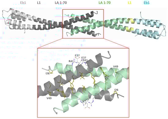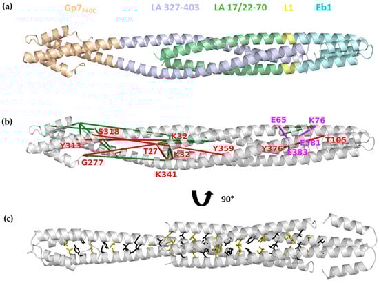 Results of chemical cross-linking were supportive of a heterotetramer composed of two N-terminal fragments and two C-terminal fragments, i.e., the species representing the ACN interaction between LA dimers. Overall, this complex should be composed of both the N- and C-terminal dimers in a parallel orientation and with some overlap length, for which several different values were reported in the literature (see Discussion). As a starting hypothesis towards the detailed molecular architecture of the complex, we took a heterotetrameric CC structure, an architecture that has been proposed previously [40,64]. To this end, the crystal structures of the LA 17-70-Eb1 and Gp7F40C-LA 327-403 dimers were manually docked together upon opening up the interacting ends of each dimer. The overlapping part was modelled using a parallel homotetrameric heptad-based CC structure as a template. The length of the overlap was varied to satisfy the maximal number of observed chemical cross-links (Supplementary Table S3, Figure 8a,b).