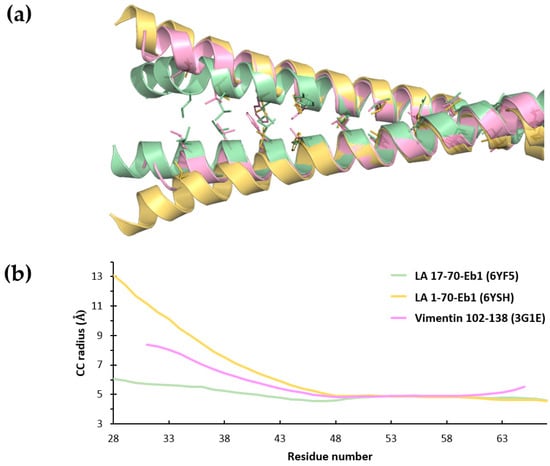 Analysis of the coil1A dimer opening in various structures (PDB codes are shown in brackets). (a) Superposition of the coil1A segments seen in LA 17-70-Eb1 (green), LA 1-70-Eb1 (gold) and vimentin 102-138 fragment with mutation Y117L (pink; PDB code 3G1E [30]). The residues in ‘a’ and ‘d’ positions forming the hydrophobic core are shown as sticks. (b) CC radius plotted as a function of residue number (according to the LA sequence) for the coil1A regions in the three structures, as determined using TWISTER [58].