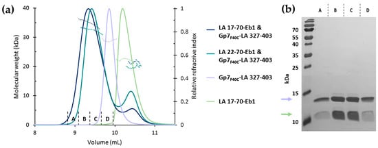 (a) SEC-MALS analysis of the LA 17-70-Eb1/Gp7F40C-LA 327-403 complex (1:1 ratio), LA 22-70-Eb1 and Gp7F40C-LA 327-403 complex (1:1 ratio), the Gp7F40C-LA 327-403 construct and the LA 17-70-Eb1 construct. The LA 17-70-Eb1/Gp7F40C-LA 327-403 complex and both individual constructs were run in 150 mM NaCl, 10 mM Hepes (pH 7.5) buffer. The second complex was run in 150 mM NaCl, 10 mM TEA (pH 7) buffer. Solid lines show the normalized refractive index profiles. Dashed lines show the MALS-based molecular weight values across the peaks. (b) SDS-PAGE of chromatographic fractions corresponding to the main peak of the LA 17-70-Eb1/Gp7F40C-LA 327-403 complex in (a). The blue and green arrows indicate Gp7F40C-LA 327-403 and LA 17-70-Eb1, respectively.