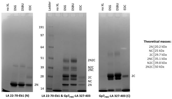 Reducing SDS-PAGE analysis of LA 22-70-Eb1, Gp7F40C-LA 327-403 and the SEC-purified complex of these two fragments without cross-linking (no XL) and after cross-linking with DSG, DSBU and EDC. The most likely stoichiometry of different bands is given at the right-hand side of each gel, where letters N and C indicate the N- and C-terminal fragments respectively. Theoretical masses of all bands are given in the side panel.
