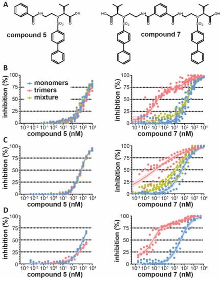 Inhibition of matrix metalloproteinase (MMP)-9-mediated proteolysis by monovalent and bivalent carboxylate inhibitors. (A) Chemical structure of the monovalent (compound 5, left) and the corresponding bivalent (compound 7, right) carboxylate inhibitors []; (B) inhibition of gelatinolytic activity of recombinant human MMP-9 monomers, trimers and their mixture (± 70% monomers and ± 30% trimers) by the monovalent inhibitor (left panel) and bivalent inhibitor (right panel); (C) inhibition of peptidolytic activity of recombinant human MMP-9 monomers, trimers and their mixture (± 70% monomers and ± 30% trimers) by the monovalent inhibitor (left panel) and bivalent inhibitor (right panel); (D) inhibition of gelatinolytic activity of human neutrophil-derived MMP-9 monomers or trimers by the monovalent inhibitor (left panel) and bivalent inhibitor (right panel). Data were fitted with either a standard or biphasic dose-response fit, as indicated in Table 1. Surface area fill represents the 95% confidence interval of the fit.