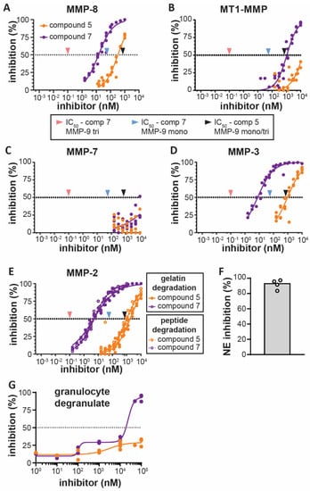 Inhibition of other proteases by monovalent and bivalent carboxylate inhibitors. (A) Inhibition of proteolytic activity of MMP-8 by the monovalent inhibitor (orange) and bivalent inhibitor (purple). Arrows indicate the IC50-values for the inhibition of MMP-9 trimers by the bivalent inhibitor (red), inhibition of MMP-9 monomers by the bivalent inhibitor (blue) and inhibition of MMP-9 monomers and trimers with the monovalent inhibitor (black); (B) inhibition of proteolytic activity of membrane-type-1-MMP (MT1-MMP)/MMP-14 by the monovalent inhibitor (orange) and bivalent inhibitor (purple); (C) inhibition of proteolytic activity of MMP-7 by the monovalent inhibitor (orange) and bivalent inhibitor (purple); (D) inhibition of proteolytic activity of MMP-3 by the monovalent inhibitor (orange) and bivalent inhibitor (purple); (E) inhibition of proteolytic activity of MMP-2 by the monovalent inhibitor (orange) and bivalent inhibitor (purple), as tested with a fluorogenic gelatin substrate (closed circles) and a fluorogenic peptide substrate (open circles); (F) percentage of gelatinolytic activity in the secretions of fMLF stimulated human granulocytes inhibited by a neutrophil elastase inhibitor (20 µM). Granulocyte secretions from four different blood donors were analyzed (n = 4). Each data point is indicated by a circle; (G) inhibition of non-neutrophil elastase-derived gelatinolytic activity in secretions of fMLF stimulated human granulocytes by compound 5 (orange) and compound 7 (purple). Data were fitted with a dose-response curve and all tests were done in the presence of 20 µM neutrophil elastase inhibitor. Each data point represents a different blood donor (n = 4).