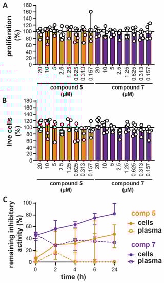 Prior to testing of the compounds in animal models, we first excluded major toxic effects or low product stability. Up to a concentration of 20 µM, compounds 5 and 7 did not reduce proliferation of the U-87 cell line (Figure 3A), nor did they induce cellular toxicity (Figure 3B). Furthermore, when added to freshly isolated mouse blood, inhibitory activity of compounds 5 and 7 remained detectable up to 24h later (Figure 3C). Interestingly, over time, the inhibitory activity shifted from plasma towards the cell lysates, indicating that the compounds might be subject to cellular adhesion or uptake.