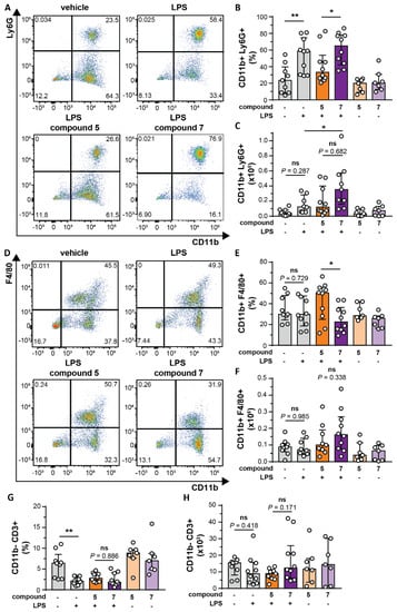 Endotoxemia was induced in 8-week old C57BL/6 mice by intraperitoneal (i.p.) injection of lipopolysaccharides (LPS) (Escherichia coli 0111:B4, cat. no. 4391, Sigma-Aldrich, St. Louis, MO, USA ) at 10 mg/kg. Control mice were injected with an equal volume of vehicle (pyrogen-free phosphate-buffered saline). A volume of 500 µl compound 5 or 7, diluted in PBS with 2% DMSO (2 mg/mL), was injected i.p. at the same time as the LPS injection (± 50 mg/kg). In animals that did not receive test compounds, this volume was replaced with 2% DMSO in PBS. After induction of endotoxemia, progression of the disease was monitored by hourly evaluation of mouse body temperature (rectal probe) and disease scoring by use of the mouse sepsis score (MSS) as described []. When the MSS score was above 21, humane endpoints were reached and mice were sacrificed. Blood was collected by cardiac puncture with a heparin-coated needle and syringe, and immediately processed by centrifugation (2000× g for 10 min at 4 °C). The supernatant (plasma) was collected and stored for further analysis. Mice were dissected and organs were stored for further analysis. Bone marrow cells were collected from femora by flushing the medullary cavity with PBS and after centrifugation the cell pellet was immediately processed for downstream analysis. All procedures were conducted in accordance with protocols approved by the local ethics committee (project number P128/2019, KU Leuven, Belgium).