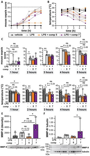 Since inhibitors with limited MMP specificity have been found to improve the outcome in mouse models for sepsis, we also evaluated the effects of compound 5 and 7 in a mouse model for endotoxemia [,,]. Endotoxemia was induced by i.p. injection of 10 mg/kg LPS and our compounds were administered i.p. simultaneously. A compound dose of 50 mg/kg was chosen based on previous studies with small-molecule MMP inhibitors [,]. Disease progression was monitored by scoring several parameters of disease development (mouse sepsis score, MSS []) (Figure 6A) and by measuring body temperature (Figure 6B). All mice that received LPS developed sepsis-like symptoms, except for one animal receiving compound 5, which developed milder symptoms. Although no significant differences were found in disease scoring and temperature (Figure 6C,D), it appeared that compound 7 induced an early and significant drop in mouse body temperature and an (although not significant) increase in disease score, pointing towards an early effect of compound 7. After five hours, some mice reached the humane endpoint (MSS >21), which resulted in termination of the experiment and collection of tissue samples from all animals. Since in previous studies, it was shown that induction of endotoxemia results in an increase of MMP-9 in blood and in organs affected by systemic inflammations [,], we also investigated the presence of MMP-9. As expected, higher levels of MMP-9 were found in plasma and lungs of endotoxemic mice (Figure 6E,F and Figure S3). Interestingly, the effect of compound 7 seemed to further induce the presence of MMP-9 and was found to be significantly different from the effect of compound 5.