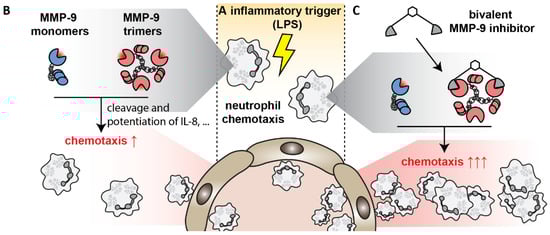 The process of neutrophil migration at early stages in infection or inflammation, i.e., from the bone marrow into the blood and through endothelia into challenged tissues (Figure 7A), is assisted by the actions of MMPs at several different levels and by different mechanisms [,,]. In addition to their originally studied roles in extracellular matrix remodeling during cell migration, MMPs can also modulate chemotactic gradients by processing of chemokines or by cleaving key cell surface receptors and anchors involved in leukocyte rolling and transmigration []. Hence, specific inhibition of particular proteases (or combinations of proteases) during inflammation, represents an interesting approach for treatment of excessive inflammation. We here identified a bivalent carboxylate inhibitor, previously developed as a molecule to disrupt MMP-9 homodimerization in models for cancer cell migration [], as a highly specific subnanomolar inhibitor for the stable trimeric proteoform of MMP-9 (IC50 = ±0.1 nM). In addition to trimeric MMP-9, the inhibitor was also potent at inhibiting MMP-2 (IC50 = 5 nM), MMP-3 (IC50 = 7.7 nM) and MMP-8 (IC50 = 14.5 nM), albeit at more than 50-fold higher doses. Similar inhibition of the monomeric proteoform of MMP-9 required at least a 500-fold higher concentration of the inhibitor (IC50 = 56 nM). Whereas we have previously shown that monomeric and trimeric MMP-9 are differentially inhibited by the natural inhibitors TIMP-1 [] and α2M [], the bivalent compound 7 is the first synthetic inhibitor to discriminate between monomeric and trimeric MMP-9.