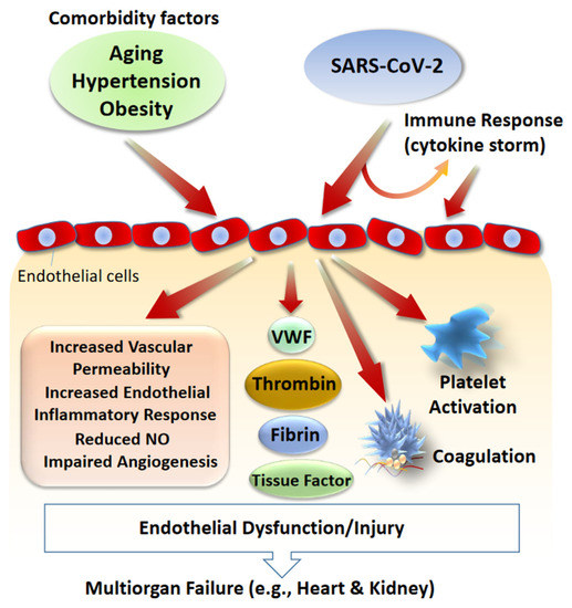 Endothelial dysfunction is an important component of a number of human diseases that also represents the common denominator of all COVID-19 co-existing conditions such as hypertension, diabetes, and obesity which are major contributing factors for COVID-19-related deaths. Consistent with this hypothesis, other clinical manifestations of COVID-19 include cardiac injury [9] and hypercoagulability as measured by an increased in D dimer and Von Willebrand factor (VWF) levels [11,12,13,14]. A recent study found that nearly 72% of non-survivors of COVID-19 had evidence of hypercoagulability [15]. In addition, inflammatory markers including, C-reactive protein, ferritin, interleukin (IL)-6, IP-10, MCP1, MIP1A, and TNF-α all were elevated in COVID-19 patients [16]. Numerous factors such as inflammation could contribute to the hypercoagulability in COVID-19 patients. However, pulmonary and peripheral endothelial cell injury due to direct SARS-CoV-2 infection is a likely scenario, as endothelial cell injury can strongly activate the coagulation system [17] and aggressive immune response could further augment endothelial dysfunction. Considering that Von Willebrand factor (VWF) levels is significantly elevated in COVID-19 patients (529 U/dL compared to 100 U/dL, normal) further supports the hypothesis of SARS-CoV-2 induced endothelial dysfunction or damage [13]. VWF is a circulating adhesive glycoprotein that is secreted by endothelial cells and platelets and its levels is elevated in vasculitis, inflammation, aging [18], and diabetes [19], conditions that are all associated with endothelial dysfunction. VWF activates platelets leading to platelet aggregation [20], acts as a carrier of coagulation factor VIII, and contributes to blood coagulation [21]. Moreover, VWF is a key player in vasculature system including, regulation of angiogenesis and vascular permeability. The chest X-ray or computed tomography (CT) scan found extensive vascular damage as well as evidence of respiratory distress in COVID-19 patients leading to conclusion that COVID-19 could be a disease that primarily damages the vascular endothelium [22]. The interaction between comorbidity factors, SARS-CoV-2, and vascular dysfunction/injury is shown (Figure 1).