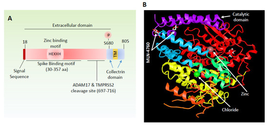 Schematic and domain structure of angiotensin-converting enzyme 2 (ACE2). (A) General domain information including, ion binding, proteolytic cleavage sites and S protein binding motif are shown. (B) Crystal structure of ACE2 and location of ion bindings and catalytic domain in complex with ACE2 inhibitor, MLN-476, is shown.