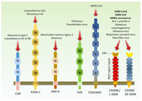 Cell adhesion of molecules are common receptors for viruses. Schematic of the most common cell adhesion molecules involved in virus recognition and viral cell entry. Coxsackievirus-adenovirus receptor (CAR) [127], intercellular adhesion molecule 1 (ICAM 1/CD54) [128], junctional adhesion molecule A (JAM-A) [129,130], and poliovirus receptor (PVR/CD155) [131]. MERS-CoV also employs carcinoembryonic antigen-related cell adhesion molecule 5 (CEACAM5) [132]. CLEC4M, (also known as L-SIGN and CD209L) and CAM, dendritic cell-specific ICAM-3 grabbing non-integrin (DC-SIGN, also called CD209) binds to Ebolavirus [133], Hepatitis C virus [134], human coronavirus 229E [135], Human cytomegalovirus/HHV-5 [136], Influenza virus [137], West-Nile virus [136], Japanese encephalitis virus [138], SARS-CoV [136,139,140], and SARS-CoV-2 [120].
