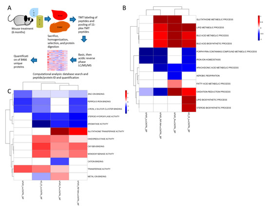 Mouse livers were prepared as described for immunoblotting, and the profiling was performed following the optimized procedure [34]. To generate peptides for liquid chromatography (LC) and mass spectrometry (MS) analyses, the protein samples were digested with trypsin from Promega (Madison, WI, USA) after resuspension in 50 mM HEPES at an enzyme-to-substrate ratio of 1:50 for 3 h. The resulting peptides were reduced by adding 1 mM 1,4 –dithiothreitol for 30 min at RT and were alkylated with 10 mM iodoacetamide for 30 min at RT in the dark. The reaction was quenched by adding trifluoroacetic acid. This acidified peptide mixture was desalted by C18 cartridges from Harvard Apparatus (Holliston, MA, USA). The desalted eluates were dried and resuspended in 50 mM HEPES, pH 8.5.