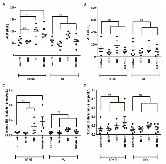 Liver function tests from human pregnane X receptor (hPXR) and mPxr−/− knockout (KO) mice treated with rifampicin (RIF) and isoniazid (INH). Sera were analyzed for markers of hepatotoxicity before liver collection. (A) Alkaline phosphatase (ALP), (B) alanine aminotransferate (ALT), (C) direct bilirubin, and (D) total bilirubin are shown. Data are expressed as the mean ± SEM. One-way ANOVA followed by Dunnett post hoc analysis was used to compare group means. ** p < 0.01, * p < 0.05, and ns (not significant).
