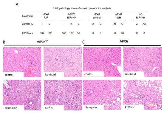 We investigated the effects of the antitubercular drugs rifampicin and isoniazid by tandem mass tag (TMT) mass spectrometry-based proteomic screening of the livers from mice with Pxr knockout (mPxr−/−) and the mPxr−/− mice with transgenic hPXR (hPXR mice) treated with rifampicin, isoniazid, or a combination of rifampicin and isoniazid. We specifically used hPXR transgenic mice because rifampicin is a specific agonist for hPXR and not mouse pregnane X receptor (PXR) [28]. Proteomic profiling identified changes in [Fe–S] cluster assembly machinery proteins, [Fe–S] cluster-containing proteins, CYP and steroid metabolism enzymes, heme synthesis and degradation, iron metabolism, nuclear hormone receptors, oxidative stress, tryptophan metabolism, vitamin B3 metabolism, vitamin B6 metabolism, and wound-healing and inflammation pathways. This study is the first to investigate the role of hPXR in these pathways by using both rifampicin and isoniazid in hPXR mice (compared to mPxr−/−mice) to identify hPXR-mediated changes in protein levels.