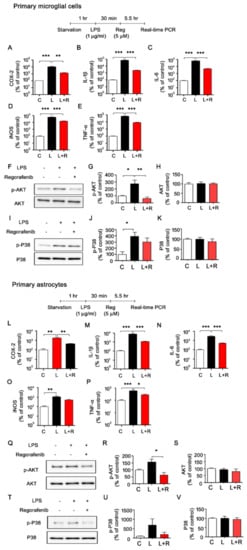 3.3. Regorafenib Alters LPS-Induced Expression of Proinflammatory Cytokines in Primary Microglia and Astrocytes