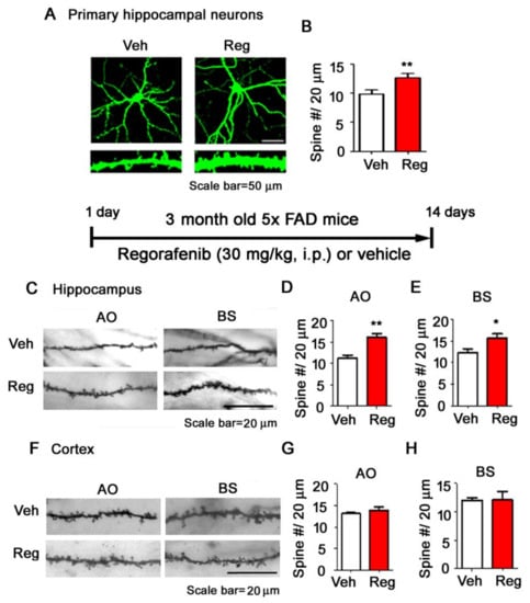 3.5. Regorafenib Significantly Increases Dendritic Spine Density in Primary Hippocampal Neurons and in the Brains of 5x FAD Mice