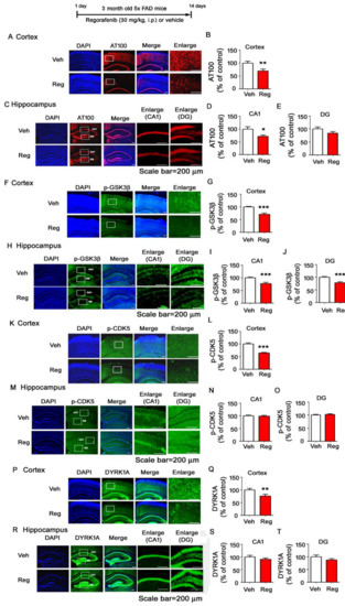 3.7. Regorafenib Significantly Reduces Tau Phosphorylation at T212 and S214 and Tau Kinase GSK3β Activity in the Brains of 5x FAD Mice