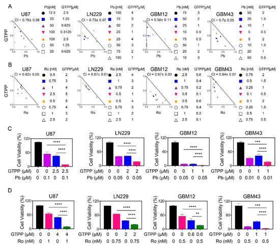 Combined treatment with gamitrinib and histone deacetylase (HDAC) inhibitors elicits synergistic reduction in cellular proliferation of glioblastoma (GBM) cells. (A,B) U87, LN229, GBM12 and GBM43 cells were treated with gamitrinib (GTPP), panobinostat (Pb)/romidepsin (Ro) or the combination of GTPP and panobinostat/romidepsin for 72h. Thereafter, cellular viability and statistical analysis were performed. Isobolograms are shown; (C,D) The graphs show cellular viability data following treatment with vehicle, panobinostat/romidepsin, gamitrinib or the combination for 72h in the indicated GBM cells (n = 3, 4). Shown are means and SD. ANOVA was used for statistical analysis. ** p < 0.01, ***/**** p < 0.001.